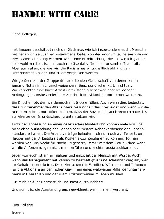 Der ausstellende Künstler und Grafiker nutzt den Raum, um auch seinen Kollegen die notwendige Aufmerksamkeit und Wertschätzung entgegen zu bringen. Nacht für Nacht sowie Tag für Tag arbeiten viele zum Mindestlohn, um der Gesellschaft den Traum vom anscheinend kostengünstigen und schnellen Service zu erfüllen.