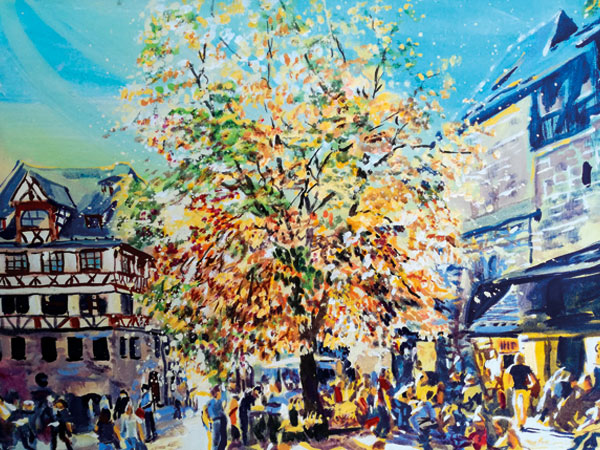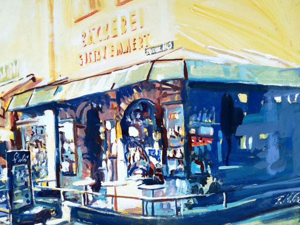 Die Arbeiten entstehen direkt vor den Motiven, also Plein Air. Das Licht und das Geschehen an den Gebäuden und Orten fließen in die Bilder mit ein. Natürlich ist es etwas Besonderes, im Freien zu arbeiten. Menschen sprechen sie an, der Wind und das Wetter wirken auf sie ein, die Lichtstimmung ändert sich...